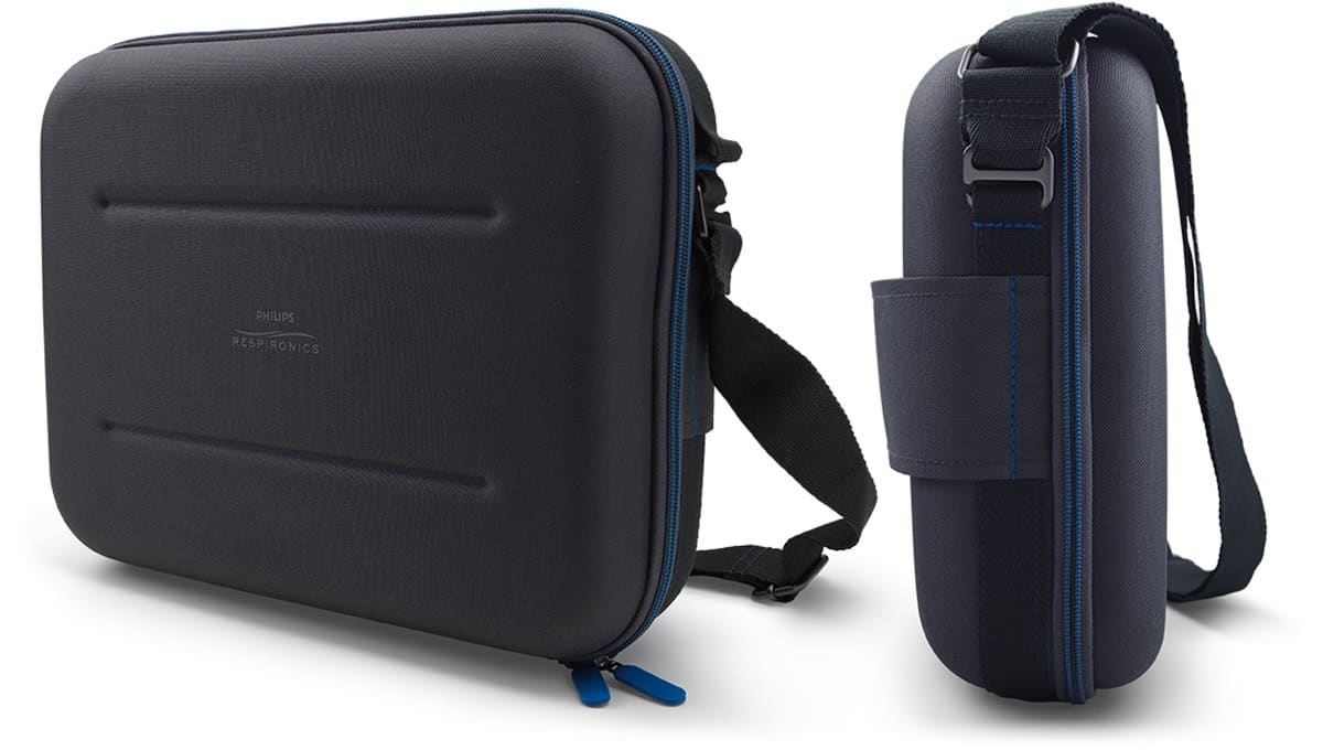 The DreamStation Travel Case includes a 65W power supply which is smaller than the power supply used for the DreamStation machine and humidifier. The power supply has a built-in USB port for charging cell phones and other electronics while using the DreamStation machine.